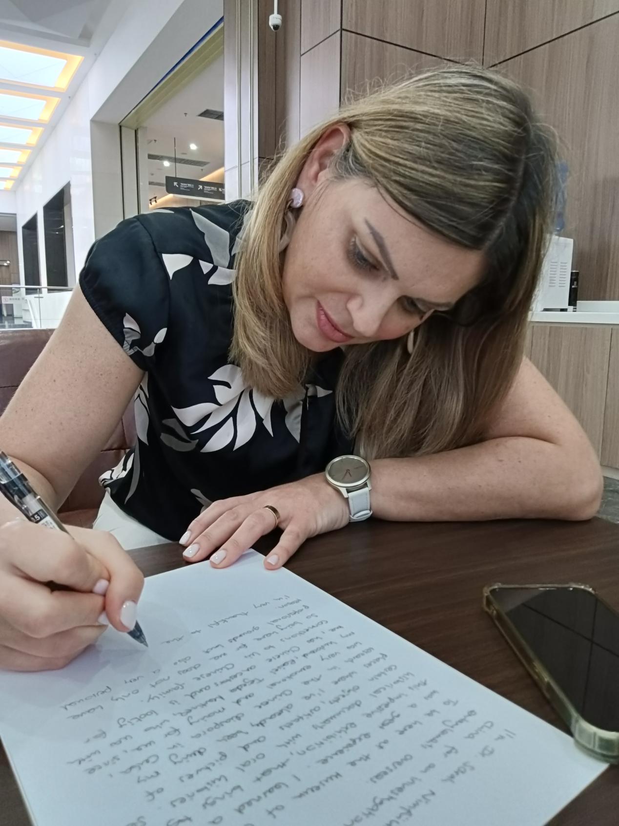 图为莎拉·尼姆富尔教授为江门华博馆题词留念